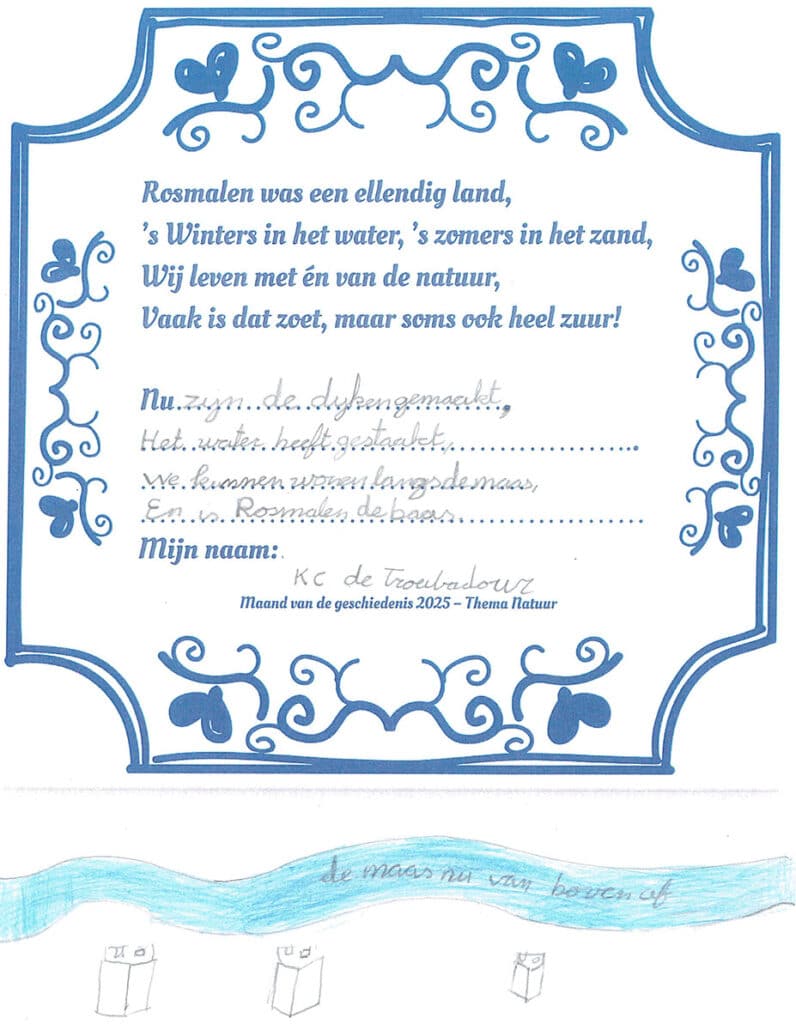 Oktober is traditiegetrouw de maand van de geschiedenis. Het landelijk thema was dit jaar: “natuur”. Onze werkgroep educatie koos in dit kader voor “Rosmalen en het water” en Jan van Nuland ontwierp voor de Rosmalense basisscholen een bijpassende les met creatieve verwerking.
