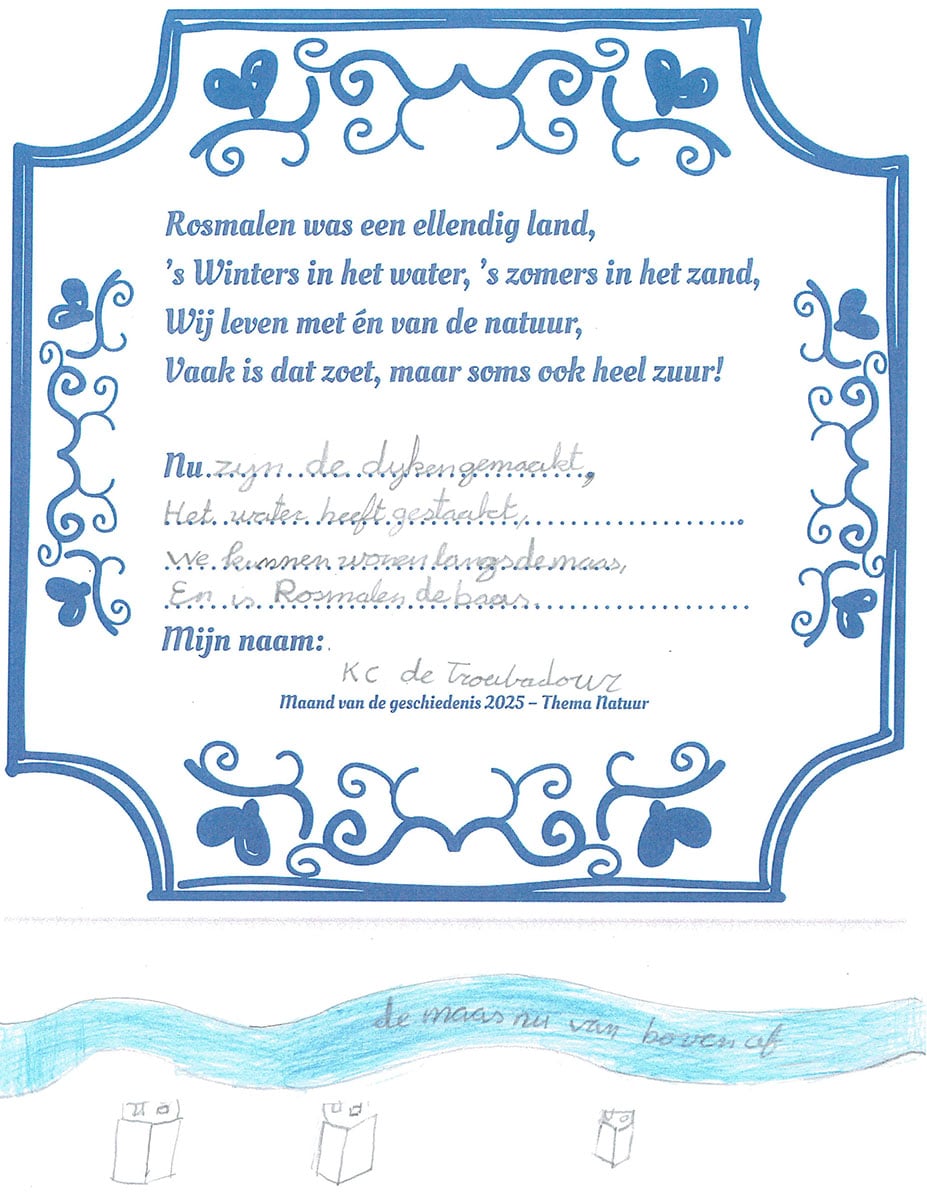 Oktober is traditiegetrouw de maand van de geschiedenis. Het landelijk thema was dit jaar: “natuur”. Onze werkgroep educatie koos in dit kader voor “Rosmalen en het water” en Jan van Nuland ontwierp voor de Rosmalense basisscholen een bijpassende les met creatieve verwerking.
