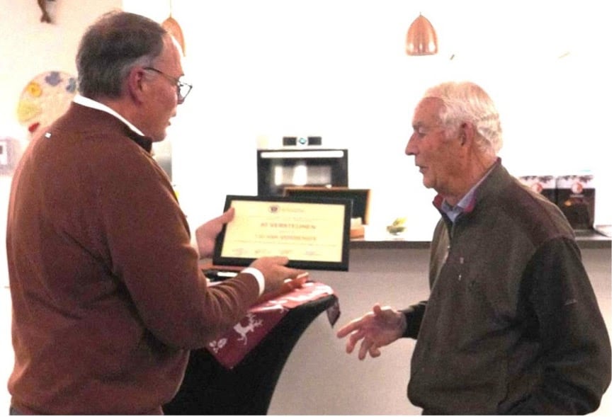 Na vele jaren van trouwe inzet, waarvoor hij al eerder werd geëerd met het zilveren draaginsigne van Brabants Heem, is voor hem de tijd gekomen om meer afstand te nemen van de werkzaamheden die hij als vrijwilliger van de Heemkundekring heeft verricht.